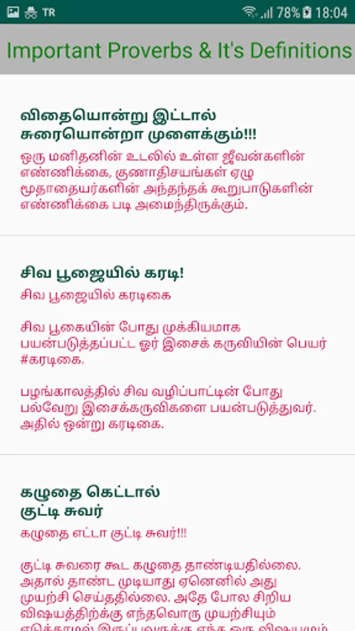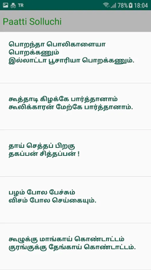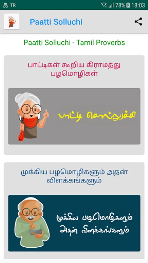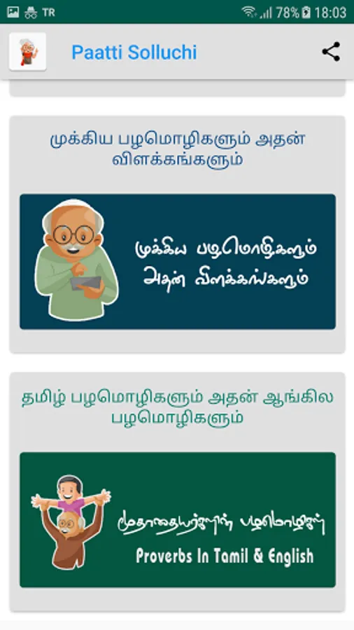 We have given there categories in this app such as paatti solluchi, proverbs and its meaning, list of proverbs in Tamil and English.