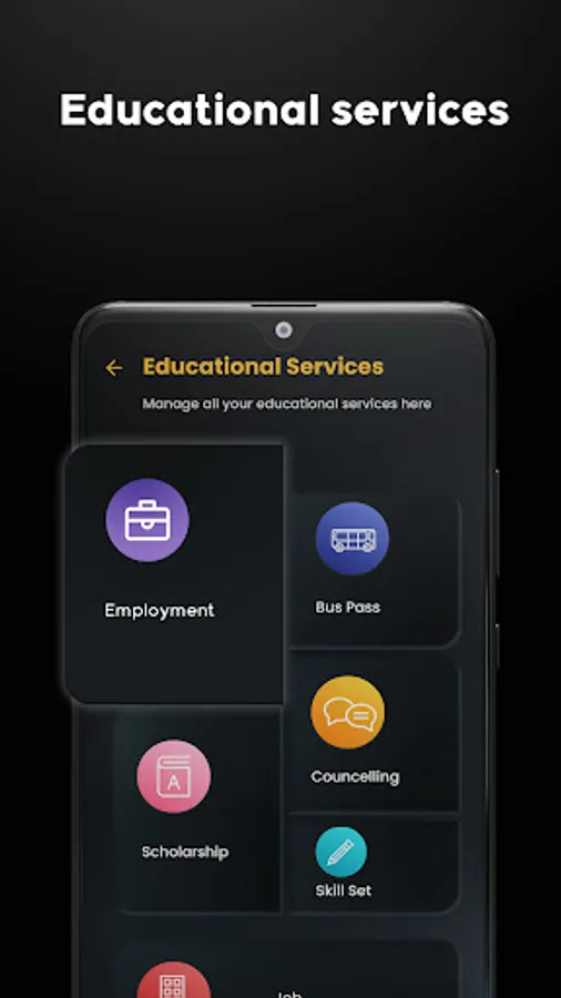 It includes utility services and educational services which further includes electricity, revenue tax payment etc. Under utility services and employment, bus pass, scholarship, counselling, job services etc under educational services.