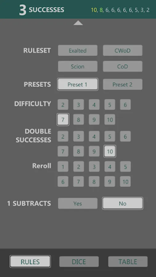 • Scion, Exalted, Classic World of Darkness, and Chronicles of Darkness rolling rule presets