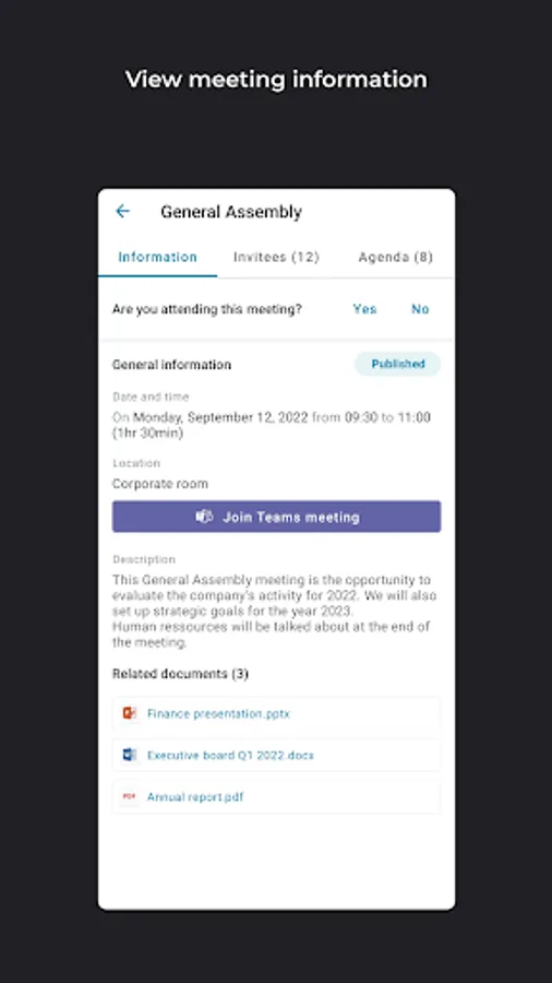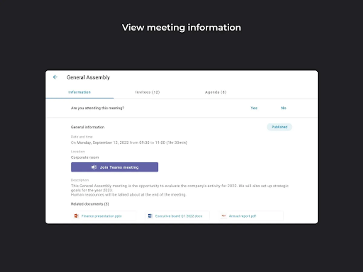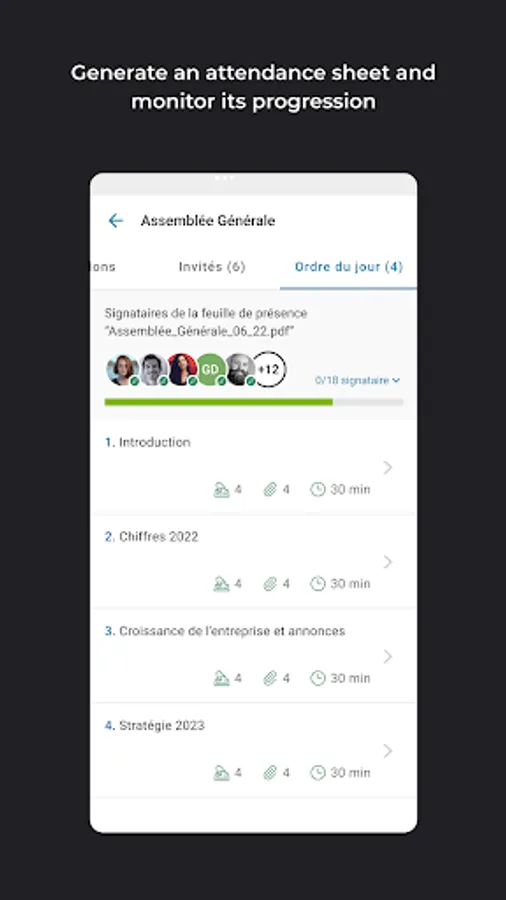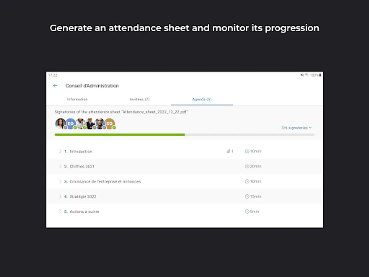 With oodrive meet, easily prepare for your governance meetings in a virtual Board Room: send invites to participants, manage your attendee list, share the agenda, link in documents for attendees to consult...all entirely online!