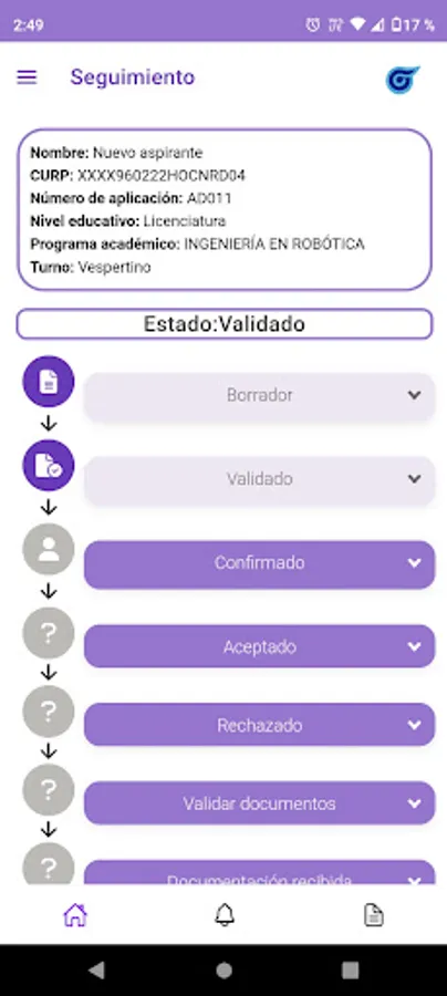 Application for applicants, which allows you to keep track of your admission and registration process.