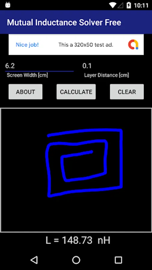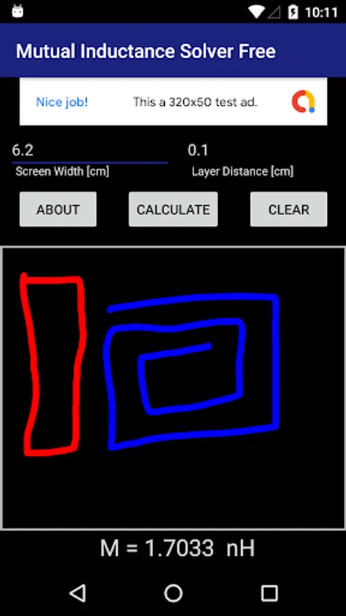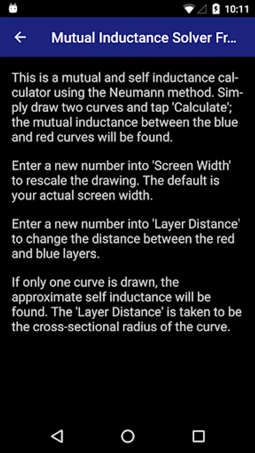 Draw any curve within the gray box. The first curve is put on the 'blue' layer and is colored blue. The second curve is put on the 'red' layer and is colored red. Then simply tap the 'Calculate' button to find the mutual inductance between the two curves. If only one curve is drawn, the self inductance is found.