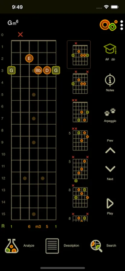 Instantly get syntactically right chord names for every inversion by entering a chord shape into the virtual fretboard.