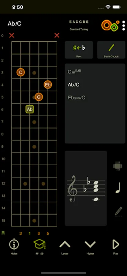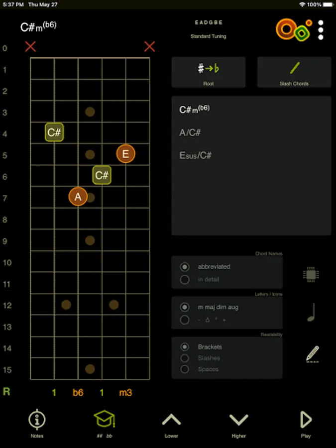 Advanced features like switching the root to its enharmonic equivalent, double accidentals, slash chord notation.