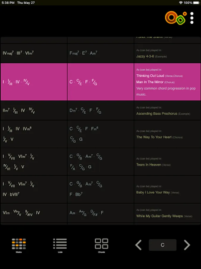 With the new unique and innovative matrix, it is easy to find, learn, understand, compare and modify the most common and important chord progressions. But you can also just take a progression from the list and learn it in several ways and keys.