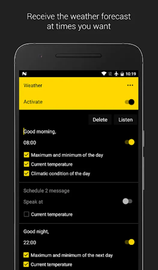 The app also provides alerts of Weather Forecast (data from OpenWeatherMap) at desired times.