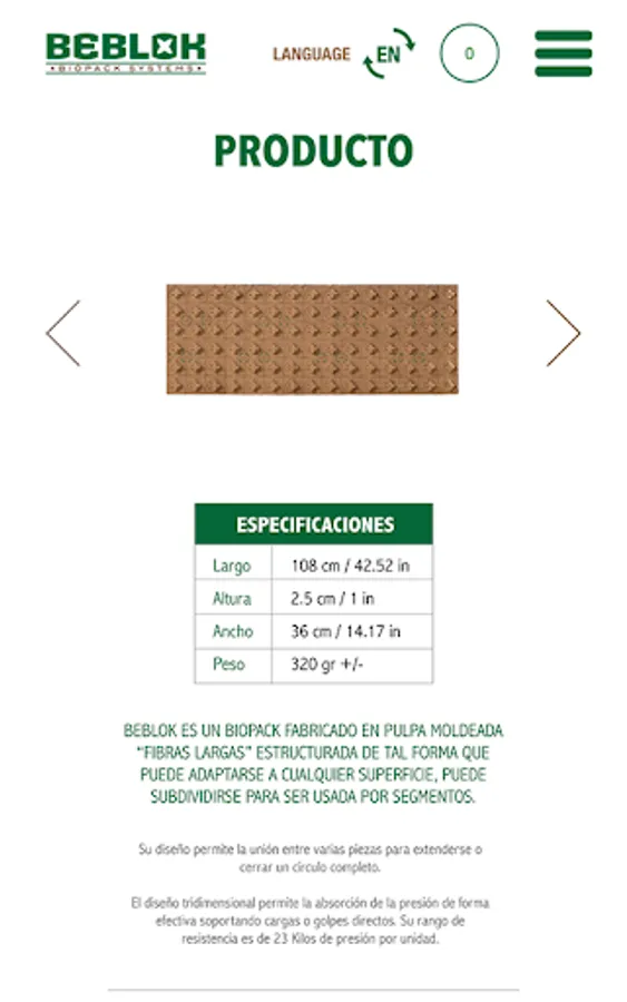 BEBLOK is a biopack manufactured with molded pulp of “long fibers”, structured in such way that it can be adapted to any Surface; it can also be divided to be used by segments.