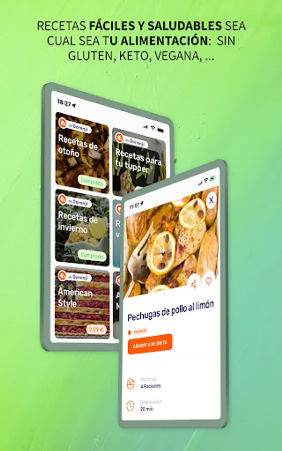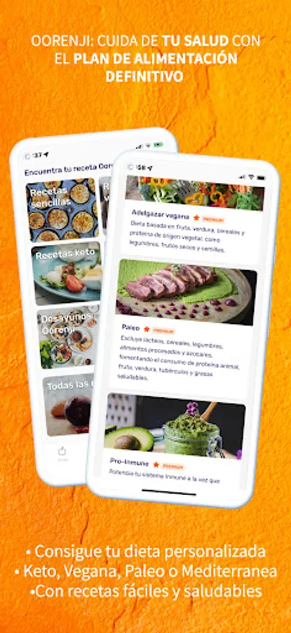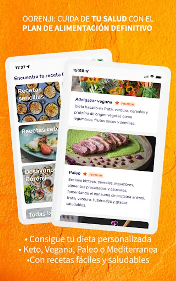 * Premium Oorenji: Dietas veganas, dietas paleo, dietas flexitarianas, dietas Keto y ayuno intermitente con diferentes objetivos; dietas para adelgazar, para mantener tu peso o para mejorar tu rendimiento deportivo.