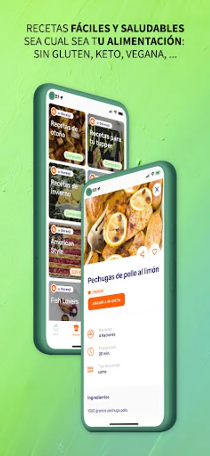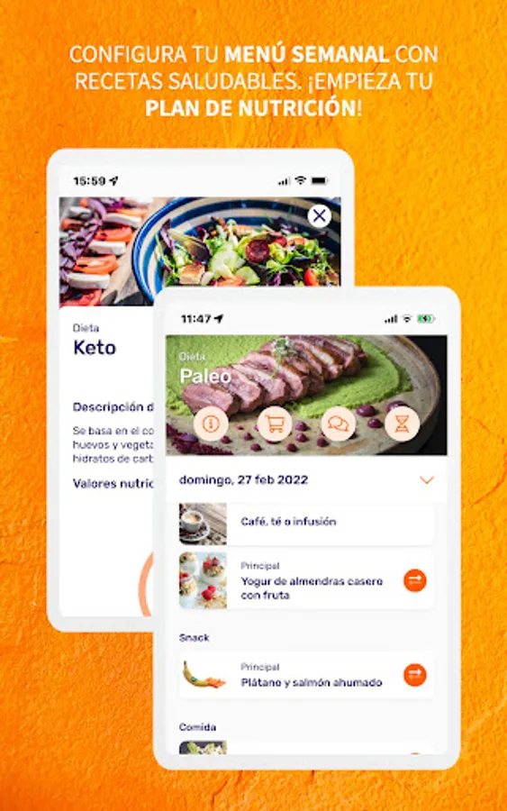 ¡Empieza a cuidar tu salud con un plan de nutrición y dietas personalizadas creadas por profesionales organizadas en menús semanales o mensuales! Adelgazar, ganar masa muscular, mantener tu peso, etc, sea cual sea tu objetivo configura tu menú semanal con recetas saludables disponibles en nuestra app de nutrición.