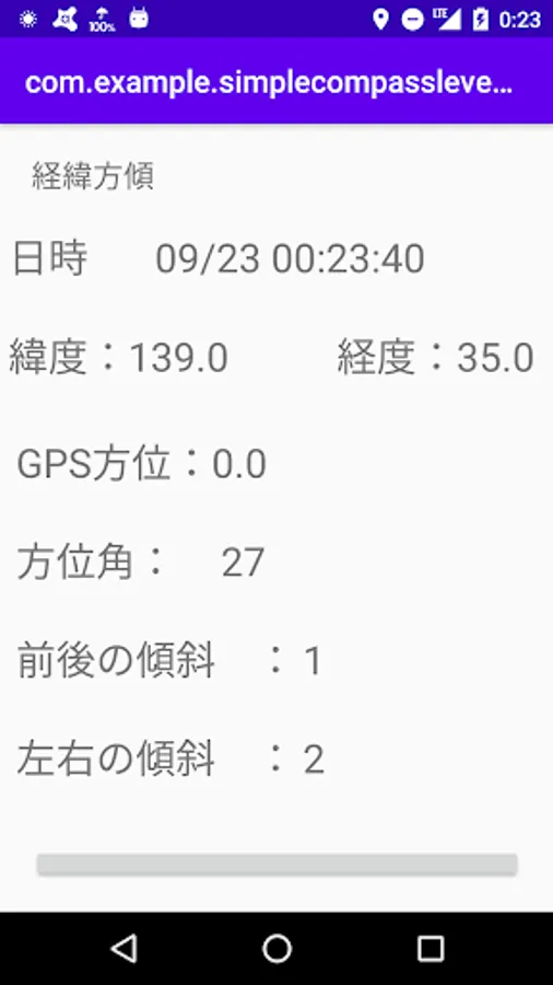 Displays the date / time, longitude, latitude, direction, and tilt.