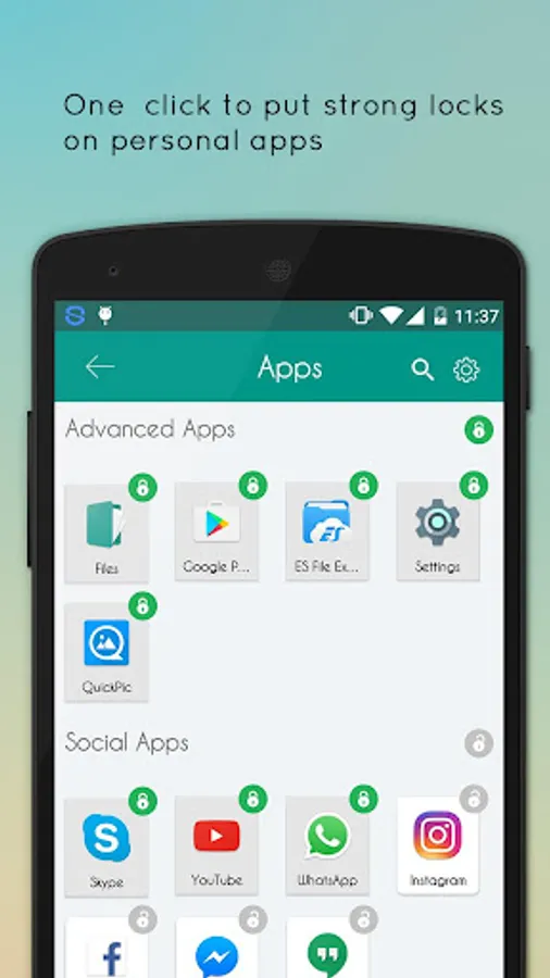 (1) Lock apps with password lock, pattern lock, or coming fingerprint lock.