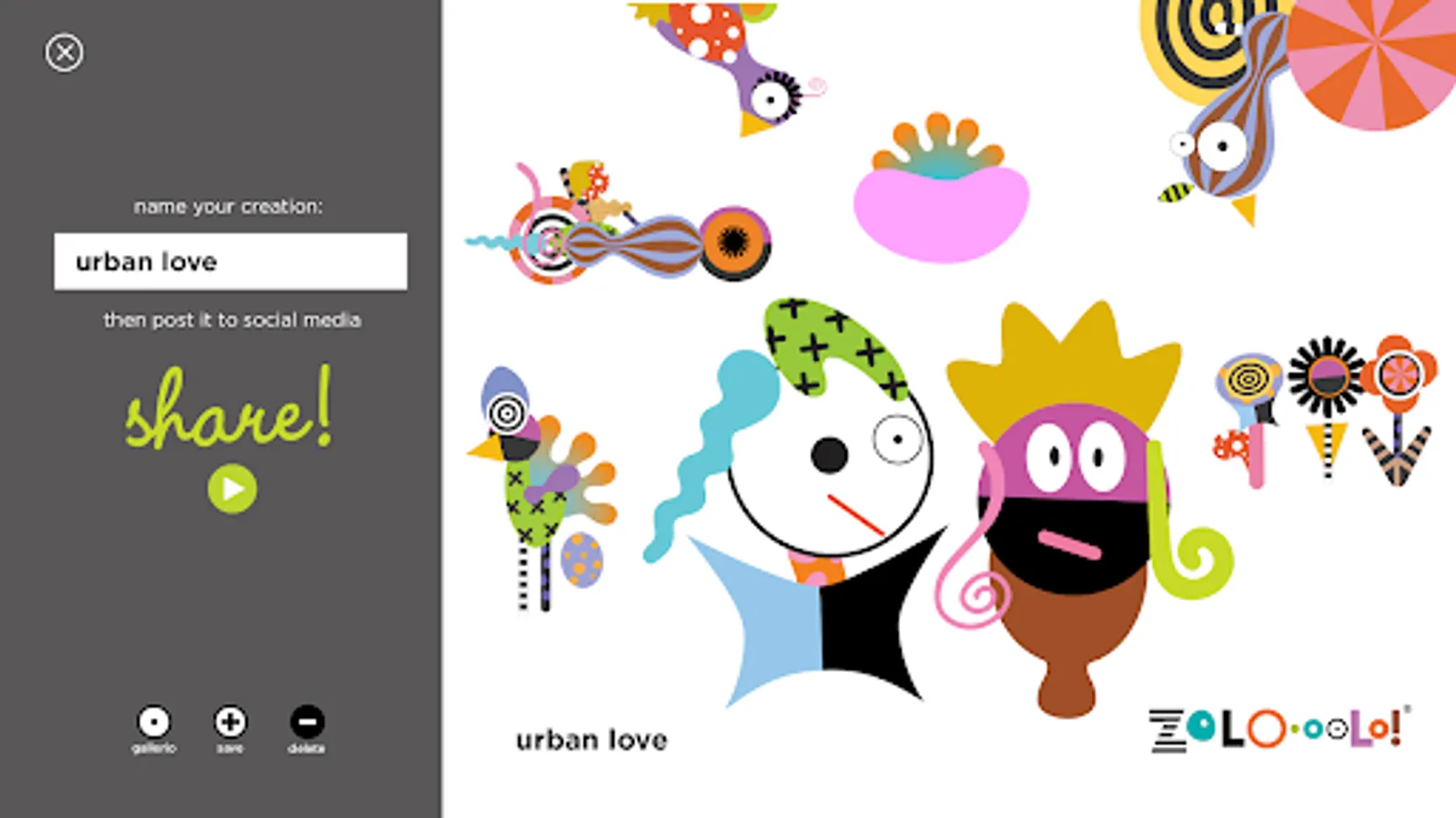 ZoLO•ooLo is easy to navigate, offering a wide variety of colors, patterns, and shapes for creating anything your imagination allows. Zolo•ooLo cultivates playfulness, stimulates creative learning and out-of-the-box thinking to help develop problem-solving skills. You can even save and share your creations with friends, open up a dialogue through art, or spend quality time creating with others! ZoLO•ooLo is a great way for parents or educators to connect with kids. But, most of all, ZoLO•ooLo is fun! It offers an encouraging, user-friendly, robust creative space for anyone and everyone to unleash their imagination. Don’t forget to play!