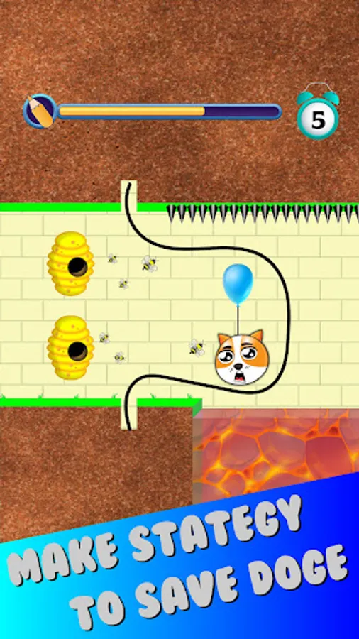 Doge rescue: Draw to save the dog is a puzzle game. Your doge is in danger draw one line with your fingers to create a wall to save the dog bees attack in draw to save the doge game. You need to save the dog draw to save with the painted wall for 10 seconds during the attack of the bad bees, hold on for 10 seconds and you will rescue the dog. Use your brain to save my pets.