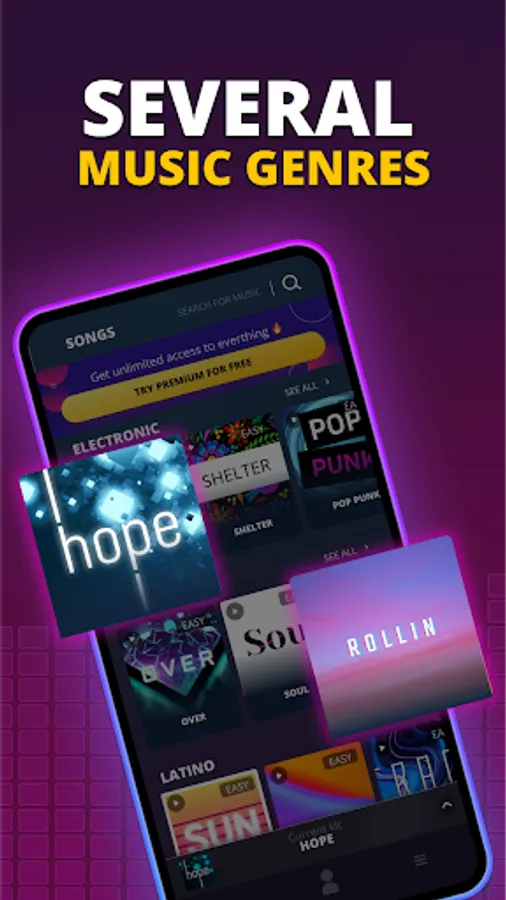 Use the tools available on this DJ app to create rhythms of genres like EDM, Dubstep, Hip-Hop, Trap, Pop and more.