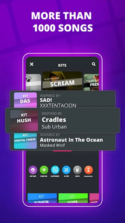 Super Pads has kits inspired by many styles like electro, edm, dubstep, hip hop, rap, pop, rock, reggaeton and even k-pop (yes, you can find BTS and even BLACKPINK in the app). You can also send us music suggestions, we make music every week based in what you want to play!