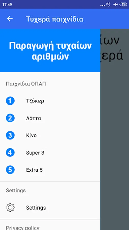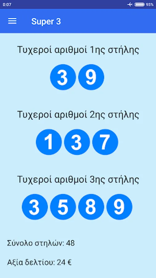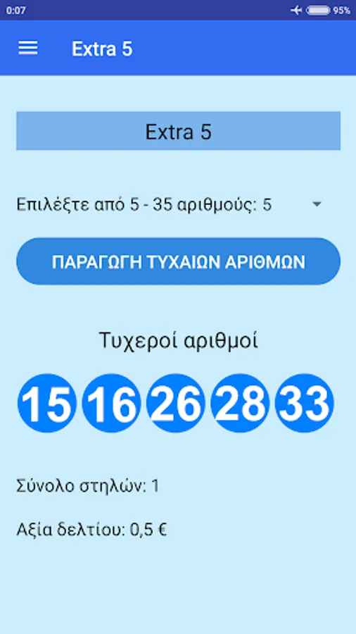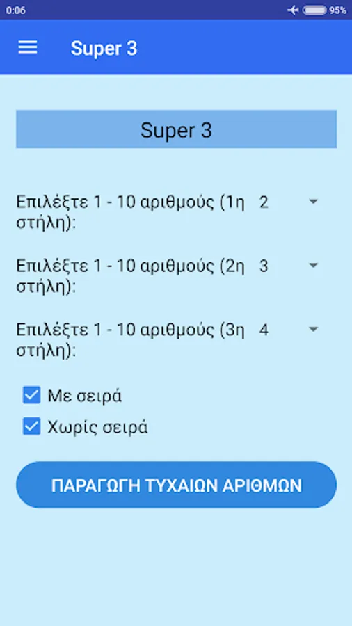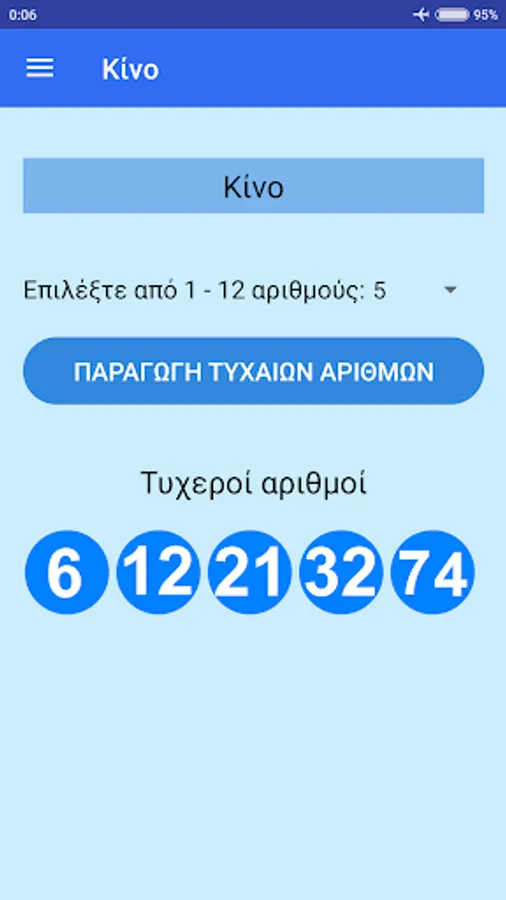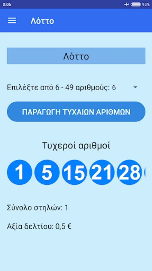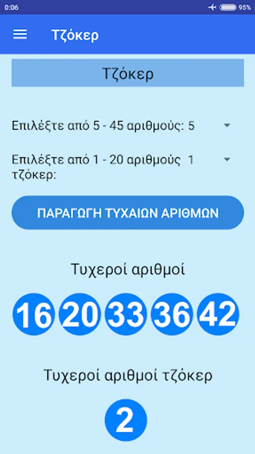 Η εφαρμογή αυτή παράγει τυχαίους αριθμούς για τα παιχνίδια τζόκερ, λόττο, κίνο super 3 και extra 5.