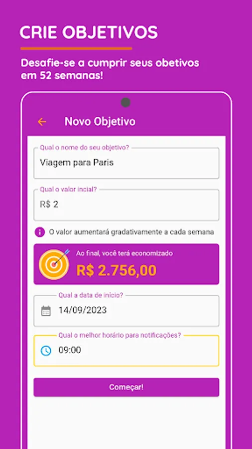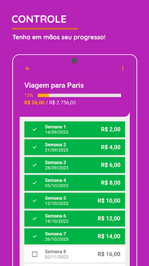 But if you want to add a higher amount, just increase the initial contribution. For example, start with R$5 for the first week, and increase by R$5 per week. So, for the second week, save R$10, for the third week, R$15, and so on.