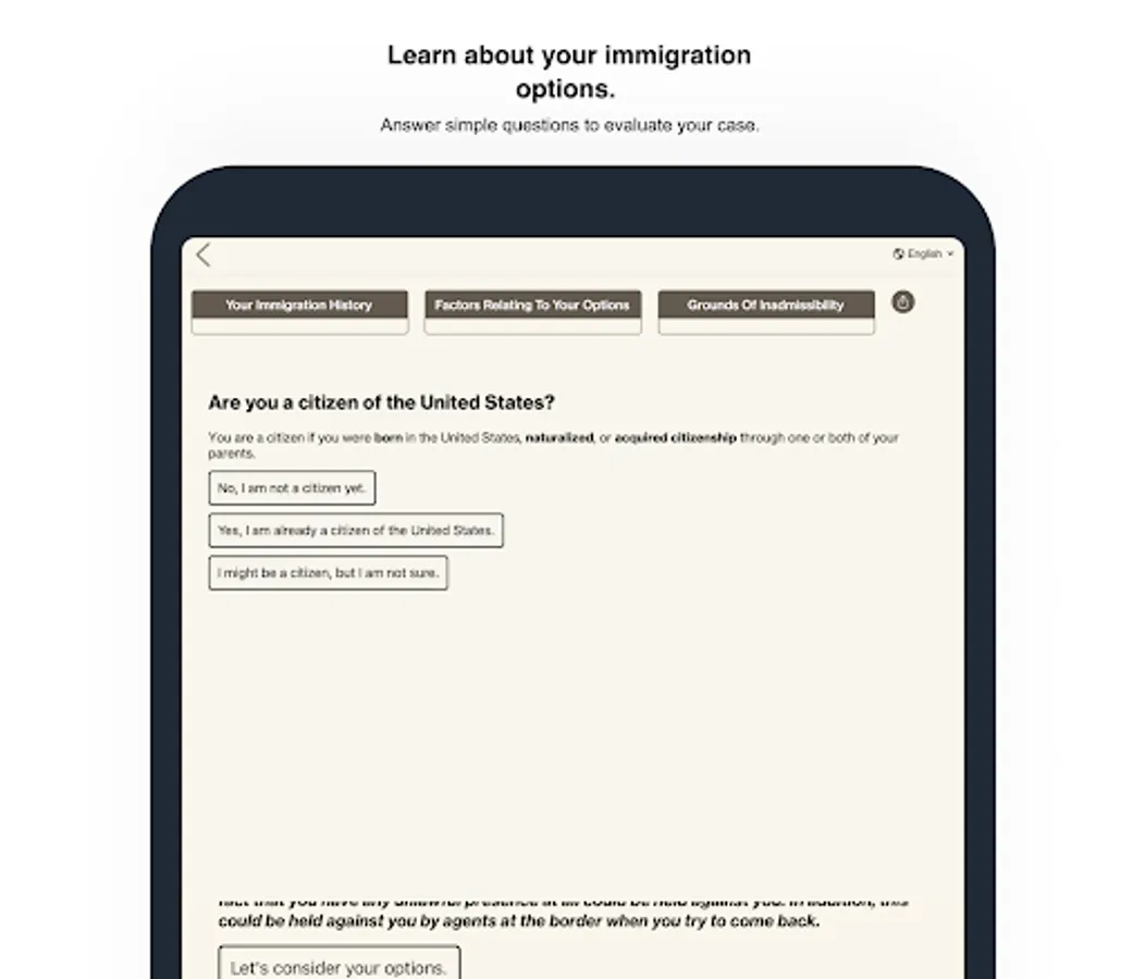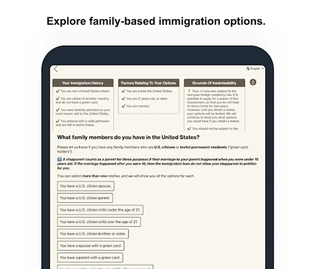 ℹ️ We believe that legal representation is critical in immigration cases, and do not encourage you to file any applications without the assistance of a qualified attorney. Even though we provide personalized information based on your answers, this is not legal advice, and using this app does not make us your attorneys.