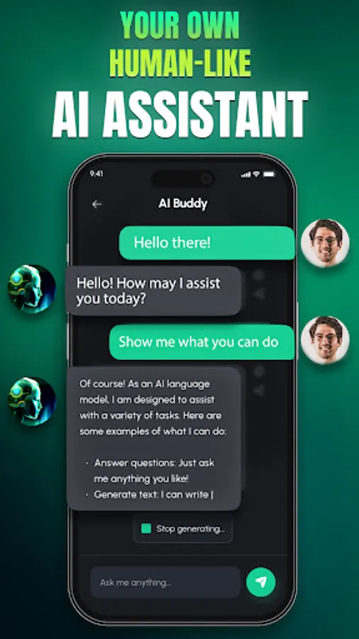 With AI Chat: GPT Chatbot Assistant you'll never have a dull moment. Engage in thought-provoking discussions with companion. Discover interesting tidbits of ChatGPT powered AI Chatbot & Writing Assistant, or simply have a laugh with its witty chatbot AI responses. Whether you're looking to kill time during your daily commute, impress your friends with newfound knowledge, be open to explore intriguing conversations with artificial intelligence, GPT-based chat AI chat assistant app is your perfect GPT 4 or virtual companion. Ask AI Anything.