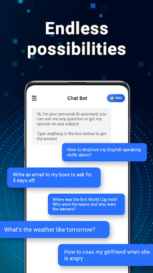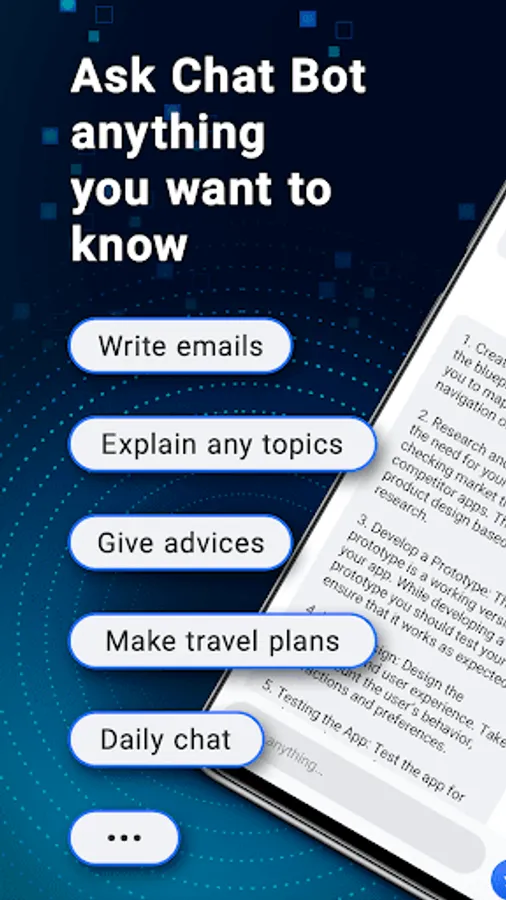 Unlock a whole world of knowledge, automation, and data with the AI Helper Chat Bot for Android. Our bot chat utilizes AI technology to answer any requests you might have. Be it a professional marketing email, an educational question, writing tasks, or practically anything you can think of. Our AI Assistant Chatbot is capable of answering almost any question and completing multiple writing tasks.