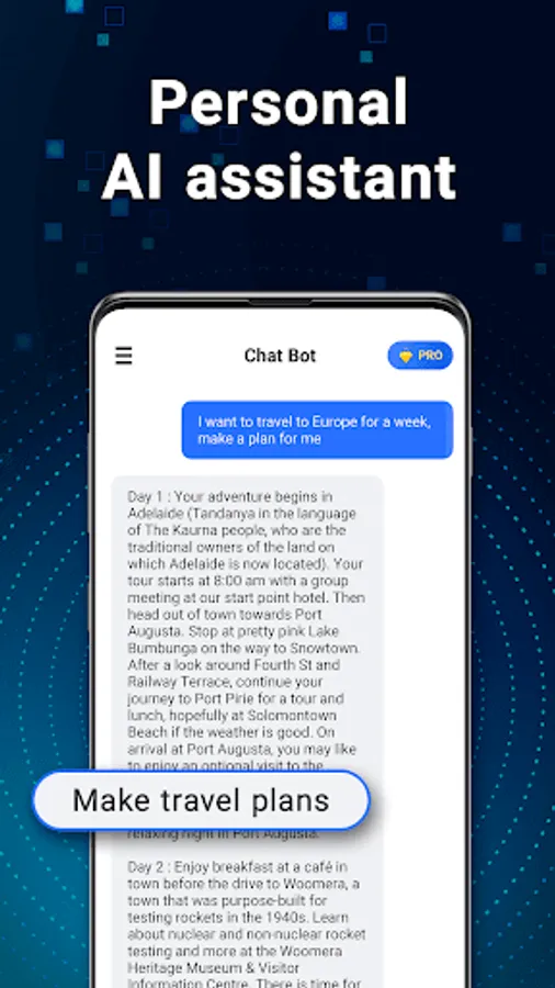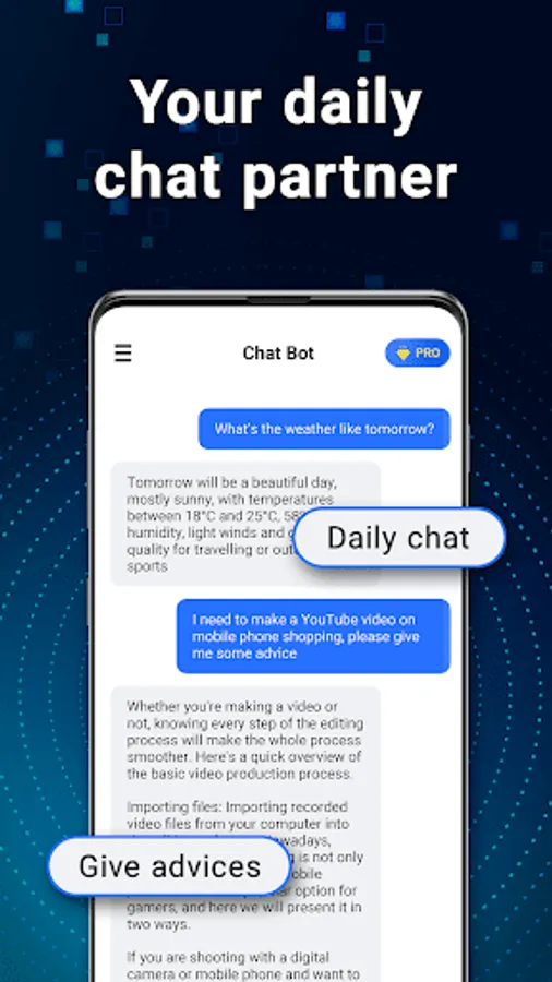 Feel the power of having a Chat bot Ai chat assistant in your pocket . Download this ai bot chat and have an AI companion for questions, and tasks.