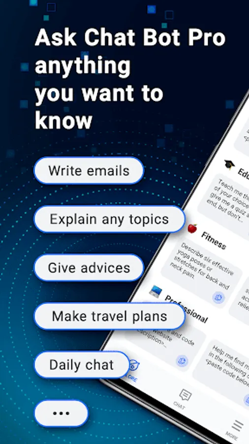 Get answers about topics of any interest. You have a whole world of information accessible within the chat bot app.