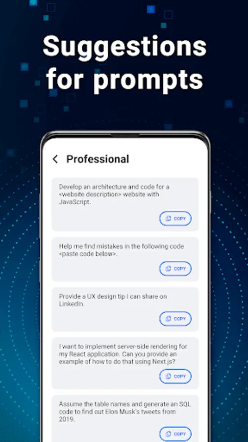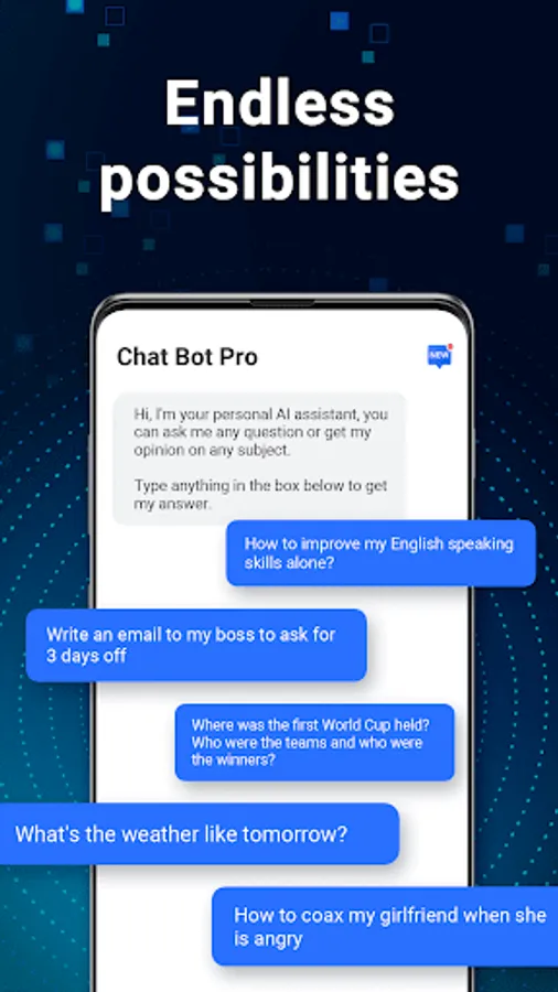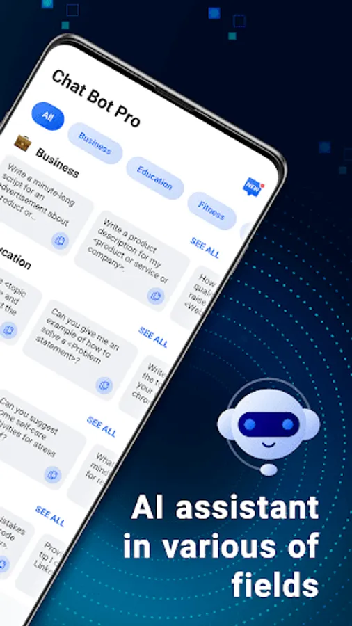 Unlock a whole world of knowledge, automation, and data with the AI Helper Chat Bot for Android. Our bot chat utilizes AI technology to answer any requests you might have. Be it a professional marketing email, an educational question, writing tasks, or practically anything you can think of. Our AI Assistant Chatbot is capable of answering almost any question and completing multiple writing tasks.