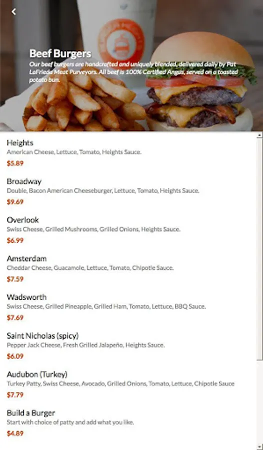 Here at Burger Heights, we’ve elevated the fast food experience, bringing together the freshest ingredients in unique combinations for irresistible burgers, dogs, and more. These aren’t your basic burgers – we source our beef, turkey and lamb from Pat LaFrieda Meat Purveyors with daily deliveries to ensure the highest quality. Your burger is always made to order and served on a toasted bun with farm-fresh produce. Our guacamole, coleslaw, and signature Burger Heights sauce are all made in house. For something lighter try the Mahi Mahi burger with homemade coleslaw and our black bean or mushroom veggies burgers. All of our shakes are made with Italian gelato for a thicker, creamier shake and come in a variety of flavors including our customer favorite Nutella®. Whether you order in person or online, your burger is made exactly the way you want it, arriving hot, fresh, and tasty every time.