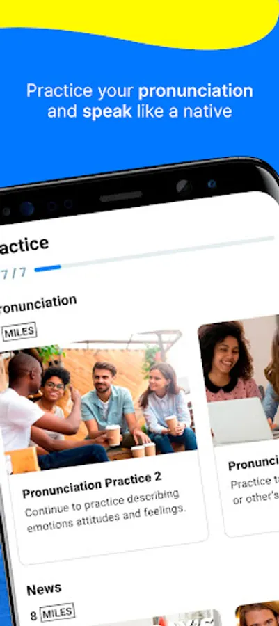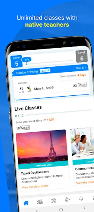 You will also find a game component, which will allow you to "travel" around the world while you learn English, make your process more fun, and stay motivated to meet your goal. Earn miles, earn badges, and be part of leagues in which you will compete with other students.