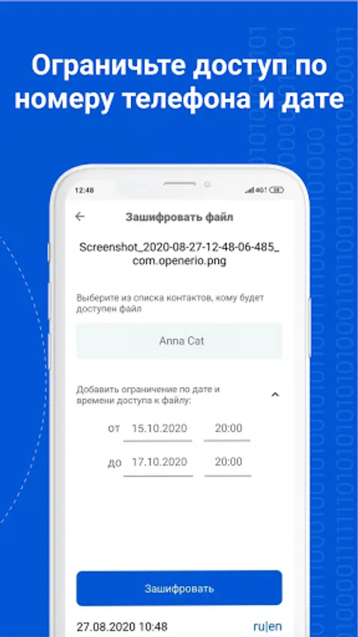 Openerio ensures the transfer of your files in encrypted form and establishes access to them by phone number, as well as, if necessary, by the time and date of file opening.