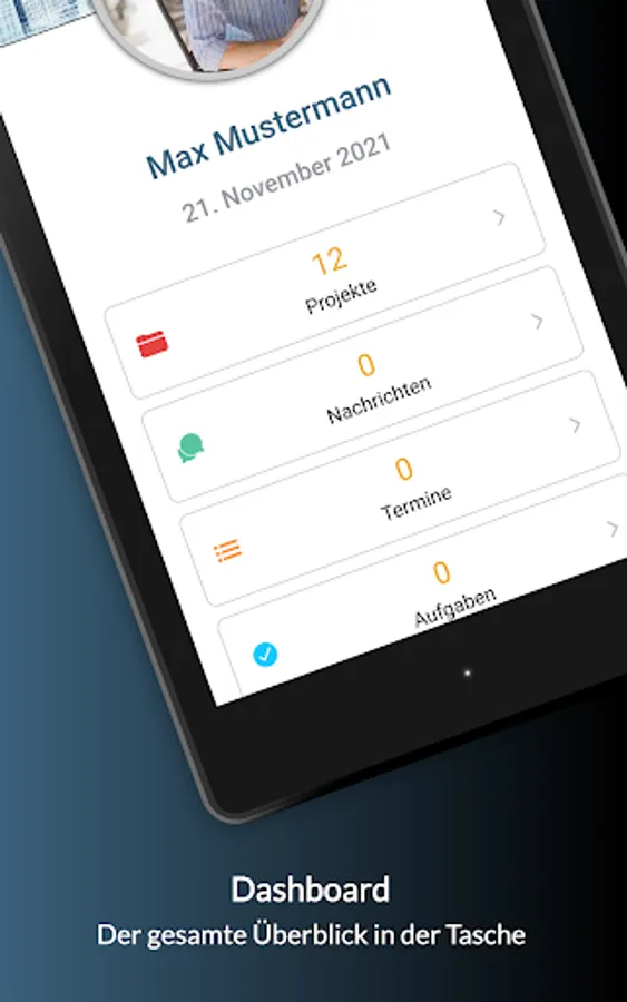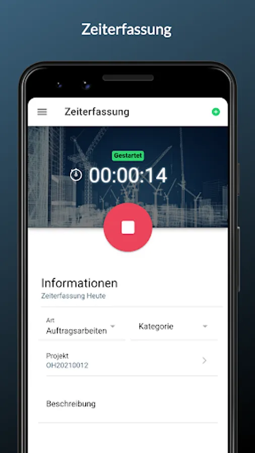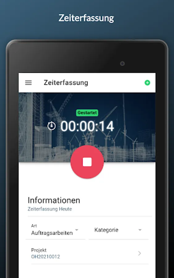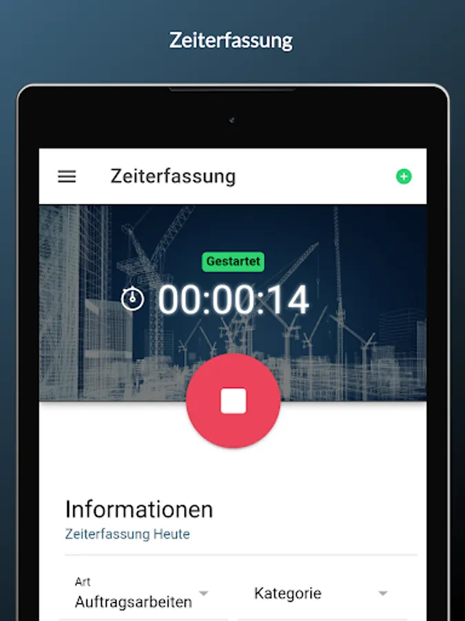 Record working hours (working hours, travel times, sick days, vacation) via the app. It is possible to record times manually and to use a start / stop function. Controlled times in the office can be blocked for app use.