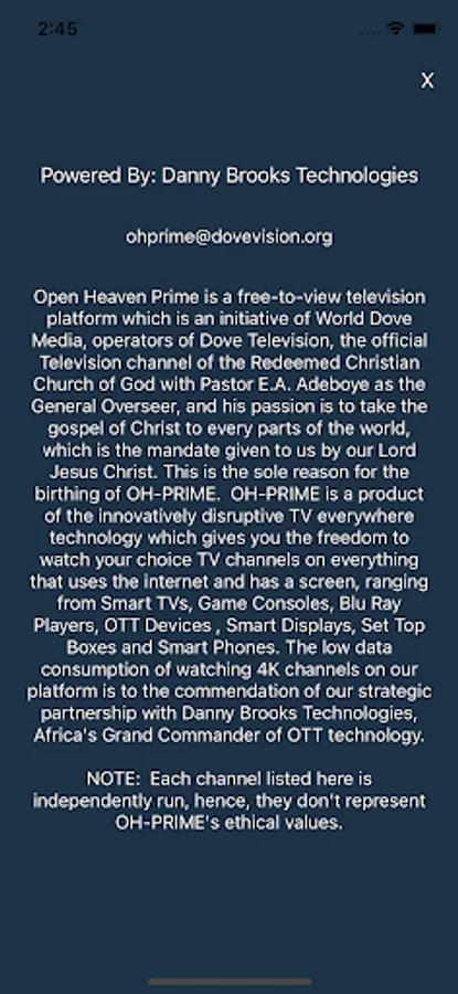 Open Heaven Prime is a free to view television platform which is a JV between Danny Brooks Technologies & the Redeemed Christian Church of God with Pastor E.A. Adeboye as the General Overseer, and his passion is to take the gospel of Christ to every parts of the world, which is the mandate given to us by our Lord Jesus Christ. This is the sole reason for the birthing of OH-PRIME.