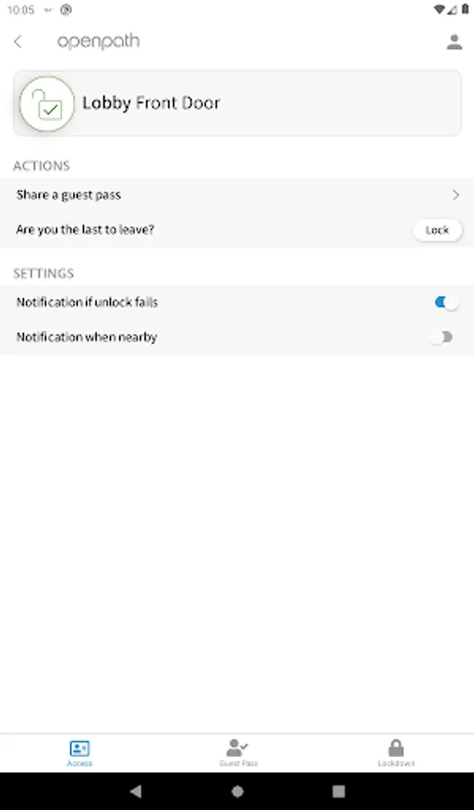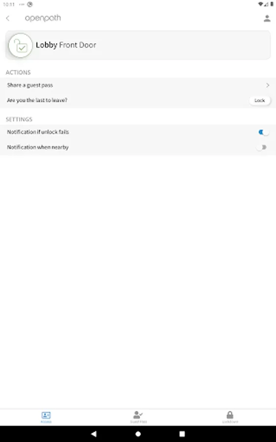 OpenPath Mobile Access allows users to quickly and securely open a door connected to the OpenPath Access Control system with their smartphone. The application works only with the OpenPath Access Control system. We leverage the following technology in your phone to ensure the best door opening experience possible: Bluetooth low energy, Wifi and LTE capabilities as well as location services and the accelerometer. To ensure you are authorized as a user of your company’s OpenPath Access Control system, please contact your administrator, who will check to see that your email address has been added and will send you links to enable your application to be authorized and credentialed. If you would like to start using OpenPath Mobile Access in your organization visit www.openpath.com to learn more about the service and how to get started.