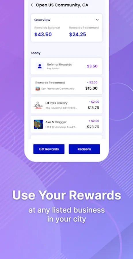 Use your rewards at any other participating businesses around town! Apply your rewards towards purchases within a few clicks from the app. Visit your favorites again and again or try something new. Open Rewards is the new kind of rewards made for communities.
