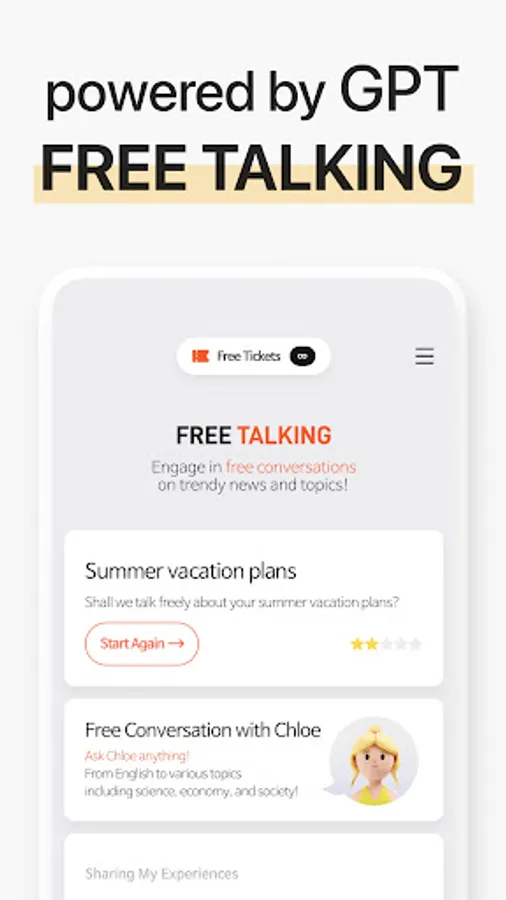 Freely talk with AI about various topics. You can have conversations every day, using role-playing or freetalking, on diverse topics of your choice.