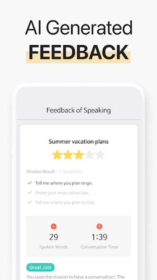 If your expressions sound awkward or incorrect, the AI will provide you with the correct expressions. You can also receive feedback after each conversation.