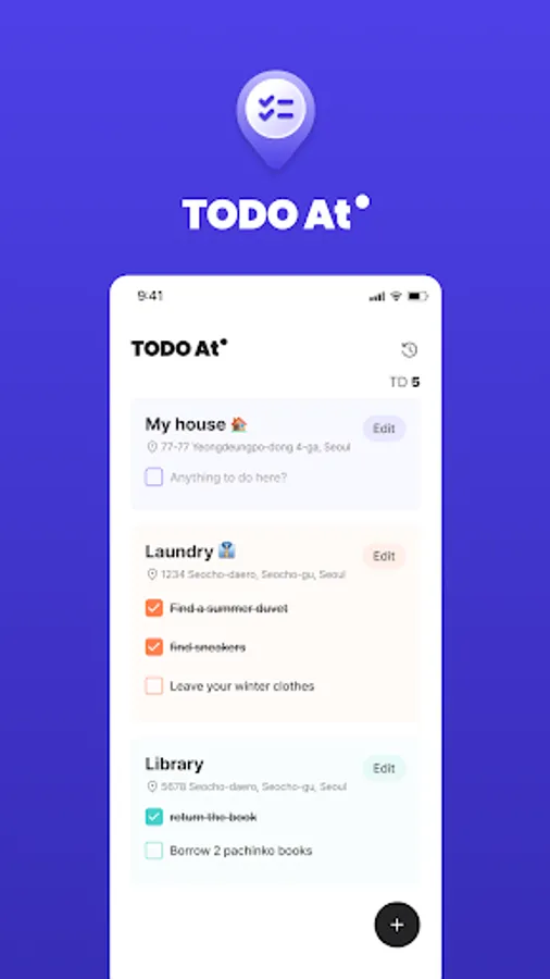 'TODO At' is a location-based reminder that tells you what to do when you arrive at a specific location. Once you register a particular location and input the tasks you need to do there, you're all set! You will receive a notification when you arrive at or leave that location so that you won't miss out on your tasks.