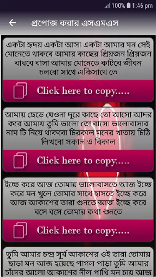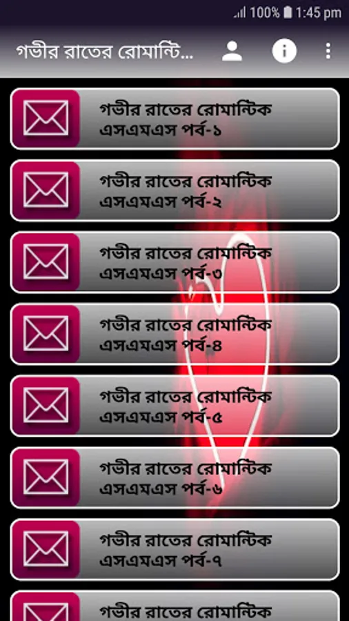 এই অ্যাপটি সাজানো হয়েছে ভালোবাসার রোমান্টিক এসএমএস দিয়ে । এই অ্যাপটিতে আপনারা যা যা পাবেন নতুন নতুন রোমান্টিক প্রেমের এসএমএস প্রেমের ছন্দ ইত্যাদি ।
