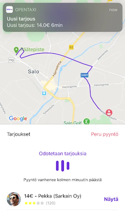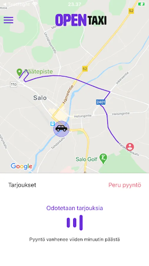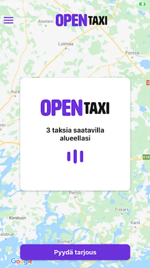 The OpenTaxi service works all over Finland. Whether you are anywhere in Finland, you can request an offer for your taxi trip from the area's drivers with one request. In response, you will receive driver offers that you can research and compare and in each situation you will choose which driver’s offer you accept.