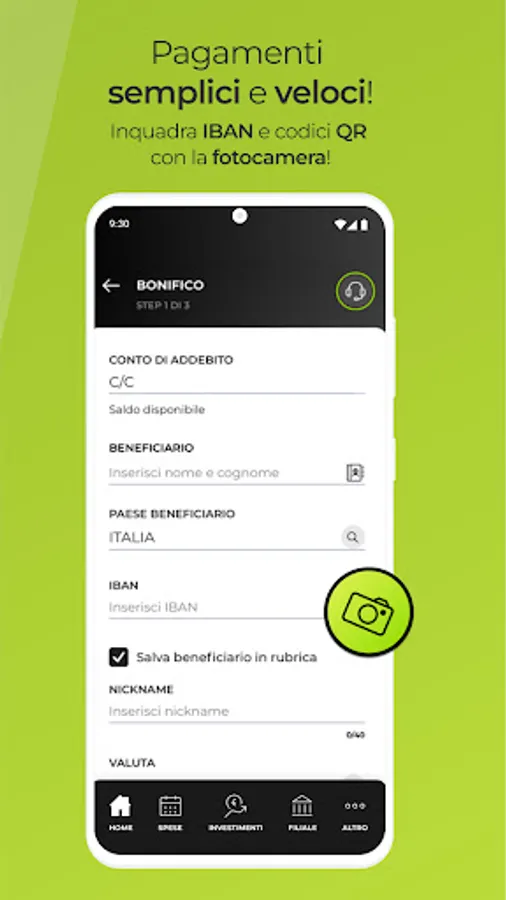 Forget about manually entering data for wire transfers, pre-printed postal payment slips, CBILL-pagoPA and MAV/RAV: to enter the codes, just tap on the camera icon and frame the IBAN or disposition code with your smartphone so that it can be acquired automatically. Furthermore, with your voice you can enter the reason for the bank transfer!
