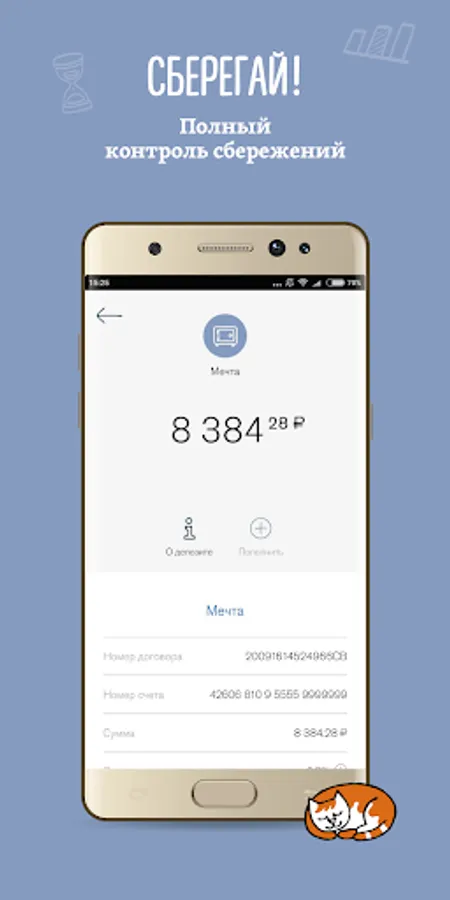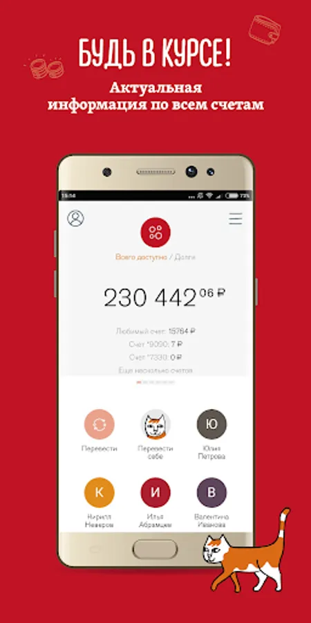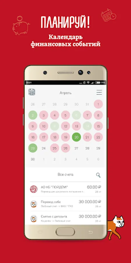 In on-line mode, the application displays the amount of available funds and the amount of debt on loans. You can always view in detail the content of each agreement (account, deposit, loan, credit card), as well as a complete list of transactions performed. It is especially convenient to follow the history of your operations in the CALENDAR, where "profitable" days are marked in green, and "expenditure" - in red.