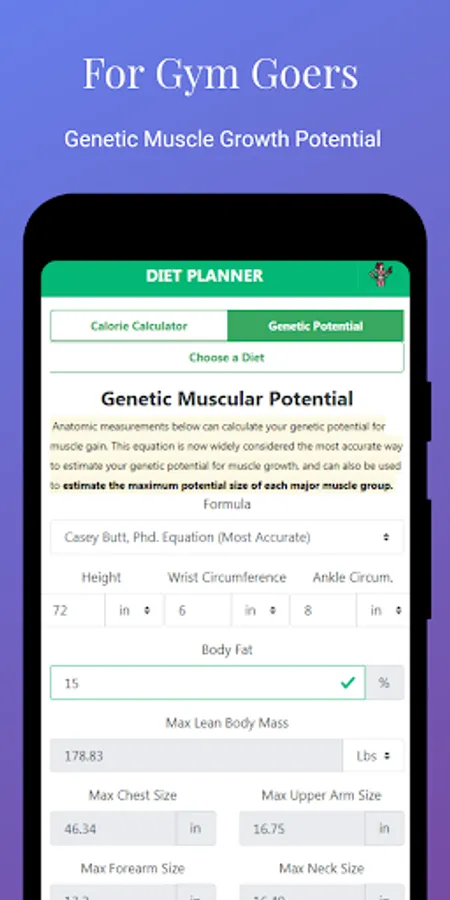 Added Feature: Genetic Muscle Potential Calculation from Dr. Casey B. Phd. - a mandatory feature for active Gym goers to calculate your maximum muscle growth potential.