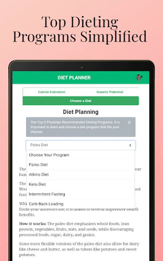 • Choose from paleo, atkins/keto, carb back loading or intermittent fasting.