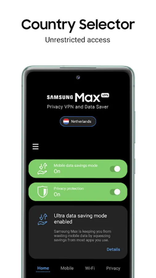 With data saving modes or privacy modes activated, all your app's network traffic is compressed and encrypted by Samsung Max’s servers before it reaches your Android device. A bank-grade, secure network connection means even when you are on public Wi-Fi your personal information is protected, and Max’s data savings cloud means the data usage is as efficient as possible.