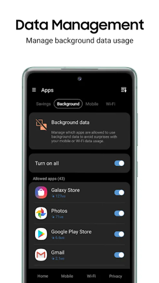 • MANAGE APPS by limiting or restricting their mobile and Wi-Fi data consumption to save money. It's easy, Samsung Max will give you alerts for apps using too much background data.