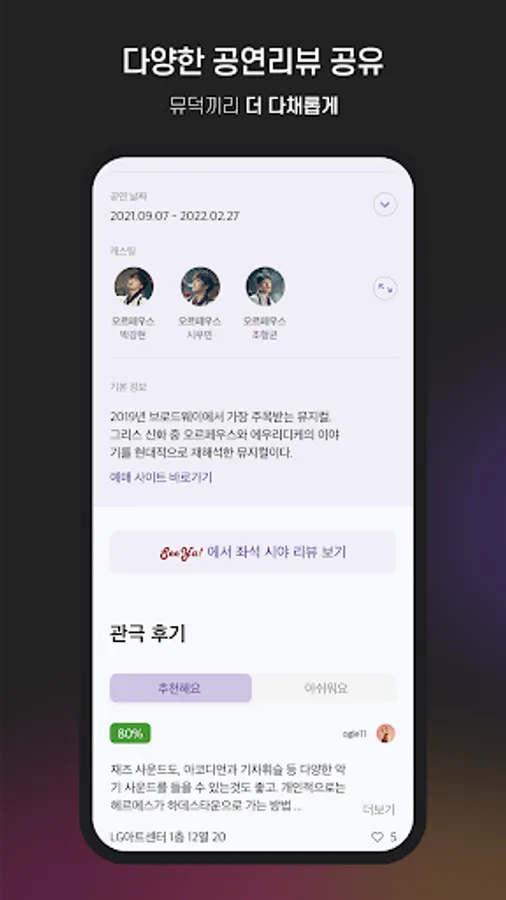 - Share information on music-optimized review, such as recommendation index, statistics, and seat view