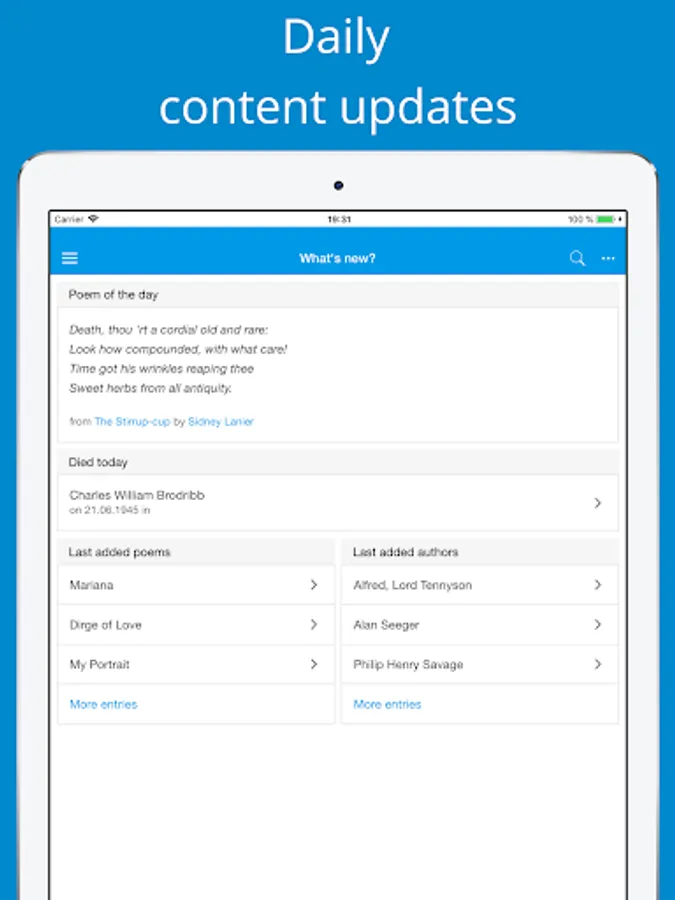 A daily updated view shows which poets were born or died on the current date, as well as the latest poems and authors added.