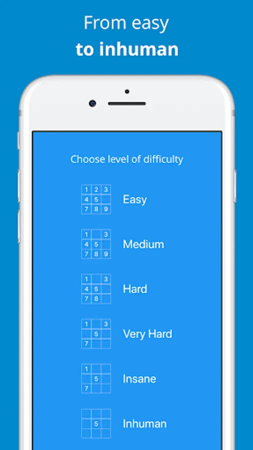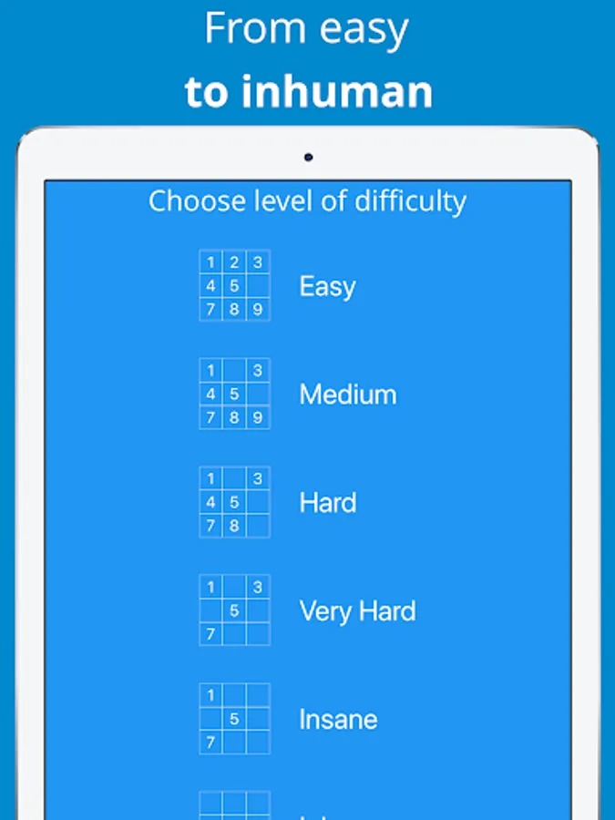 - Six levels of difficulties: Easy, Medium, Hard, Very hard, Insane, Inhuman