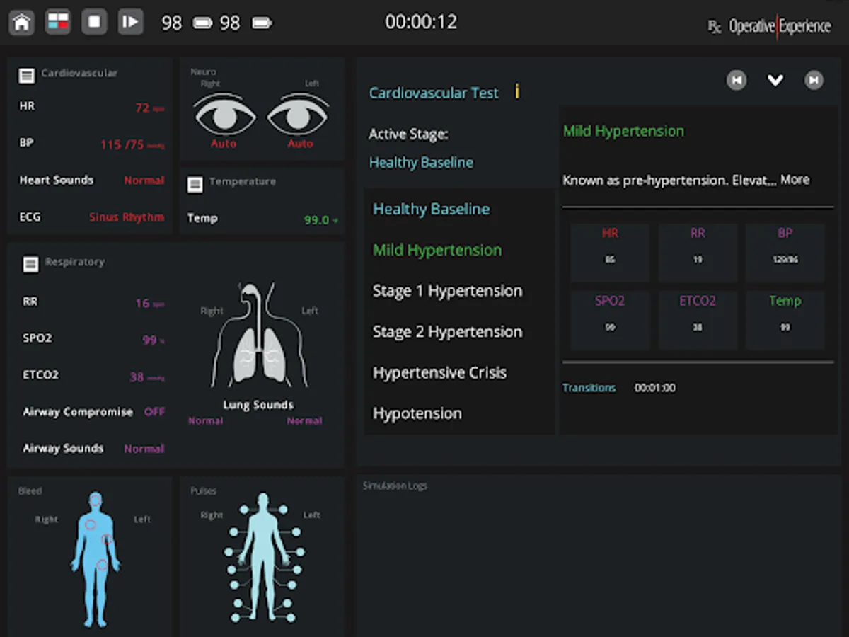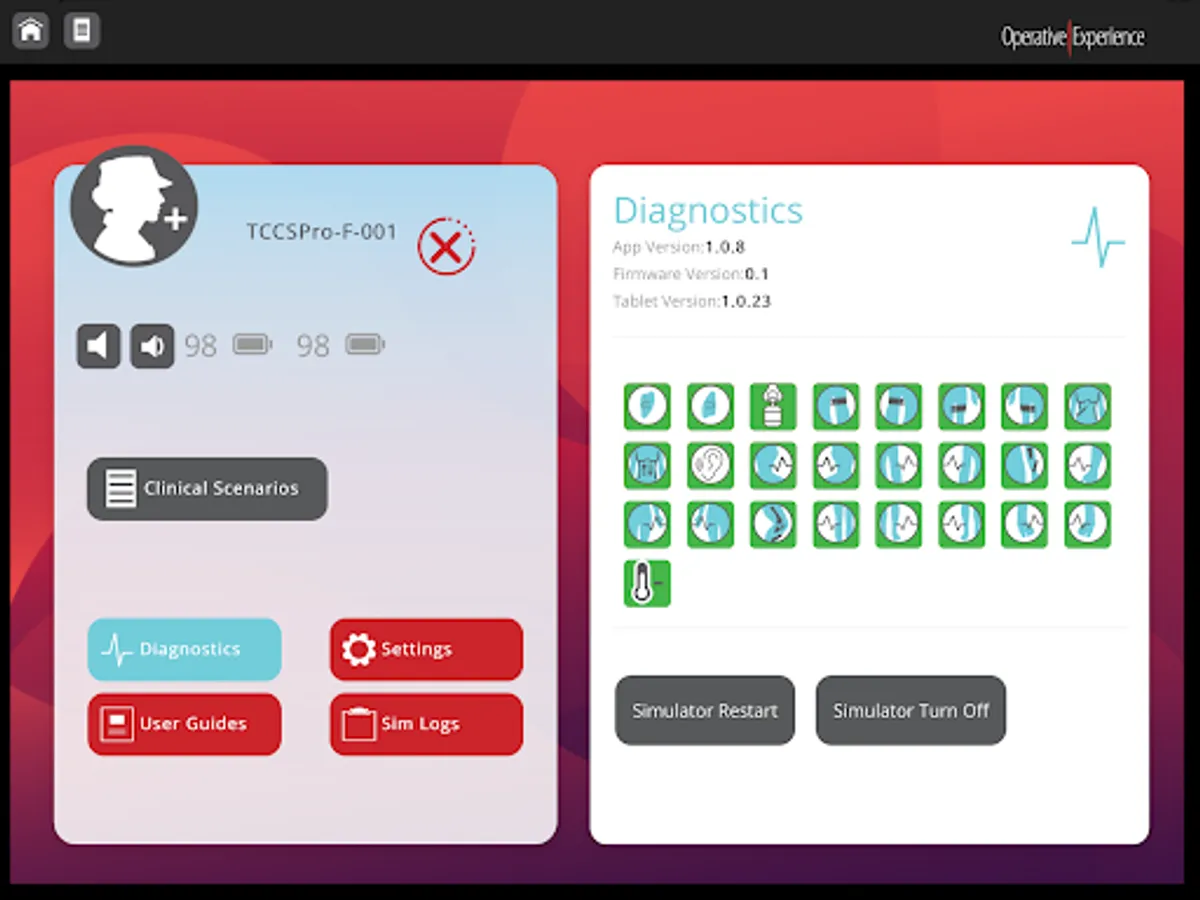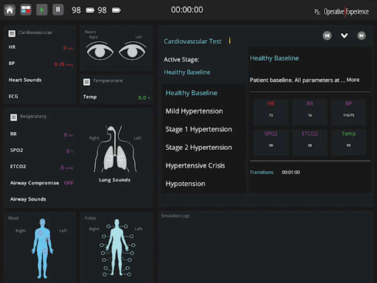 OEI Sim Pro offers a sleek, new interface for control of TCCS Pro and TCCS Plus Pro simulators with powerful new features, including clinical and trauma scenarios, drug recognition, expanded simulation logs and diagnostics as well as fully-integrated 12-lead ECG patient monitoring and advanced patient conditions and physiology for TCCS Pro and TCCS Plus simulators.