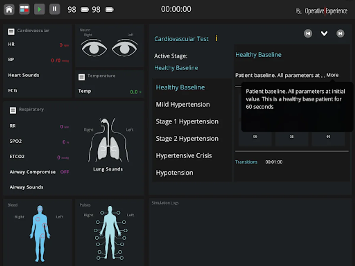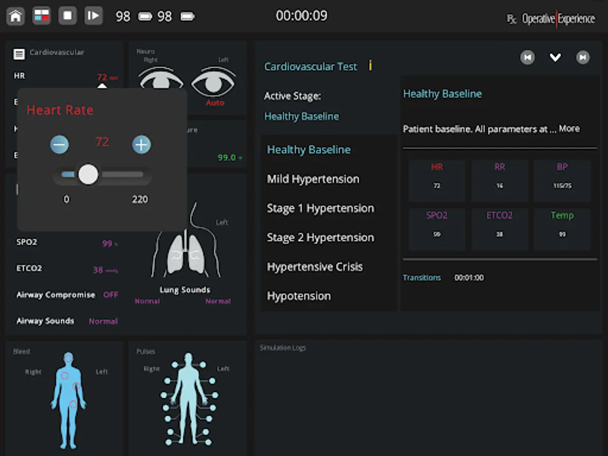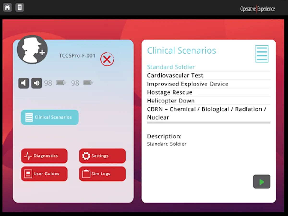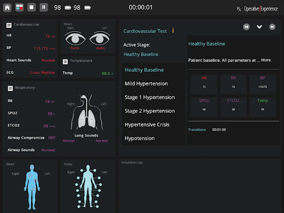 OEI Sim Pro offers a sleek, new interface for control of TCCS Pro and TCCS Plus Pro simulators with powerful new features, including clinical and trauma scenarios, drug recognition, expanded simulation logs and diagnostics as well as fully-integrated 12-lead ECG patient monitoring and advanced patient conditions and physiology for TCCS Pro and TCCS Plus simulators.